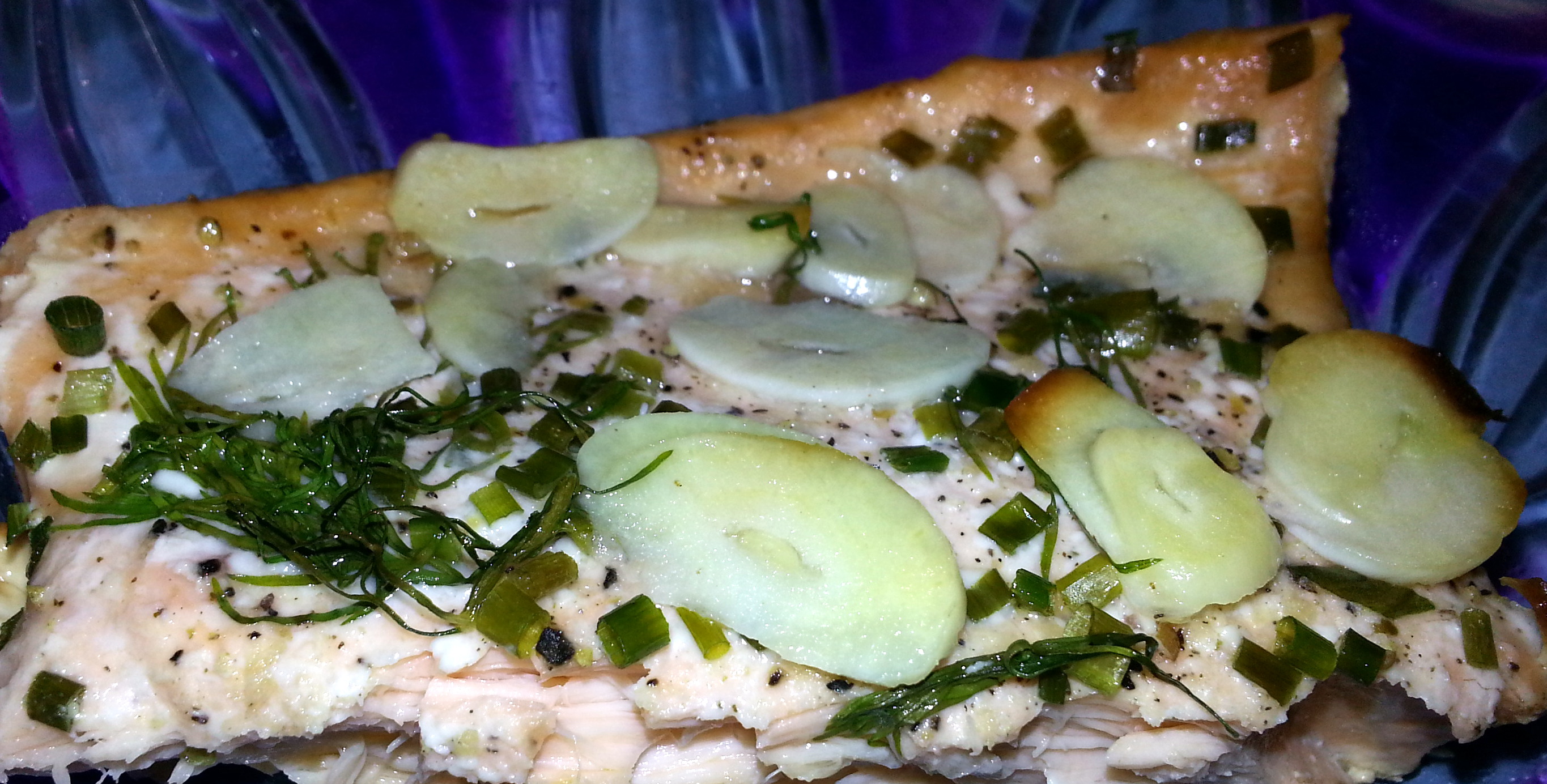 - Put the salmon fillets in the glass pan. Spread 1/2 teaspoon of the ginger over each fillet. Drizzle the lemon juice over the fillets. Sprinkle the fillets with pepper if desired.
