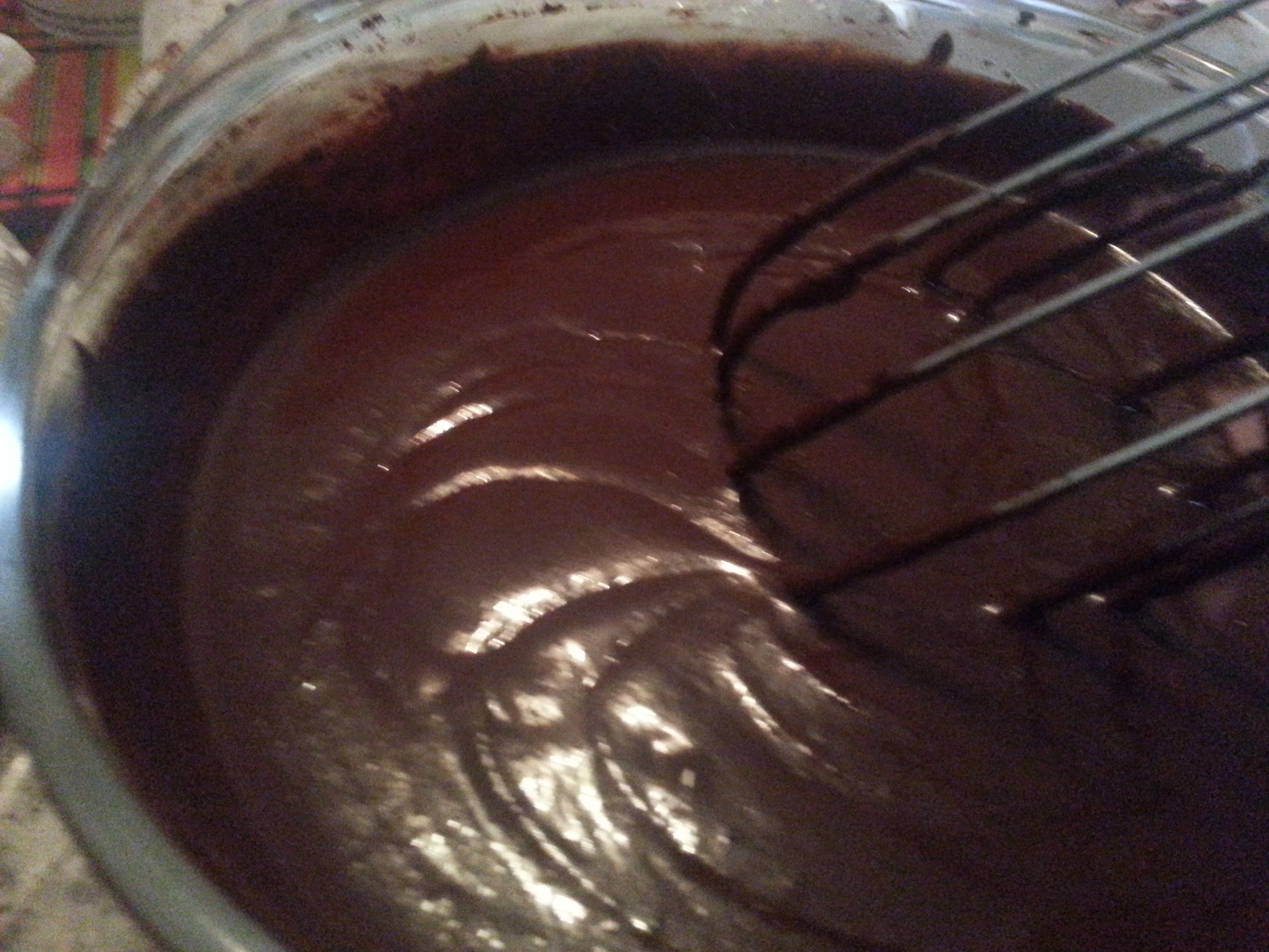 - Pour the melted chocolate into the milk-honey mixture and whisk gently until it has a thickened consistency, but do not overbeat. (Stir it in a consistent circular motion so as not to introduce air.)